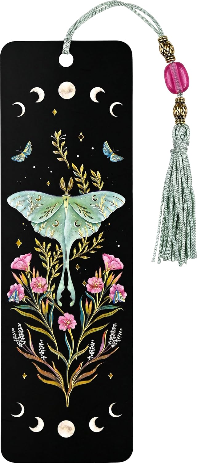 Stunning bookmark features a magnificent luna moth, surrounded by flowers, stars, nocturnal butterflies, and lunar phases!