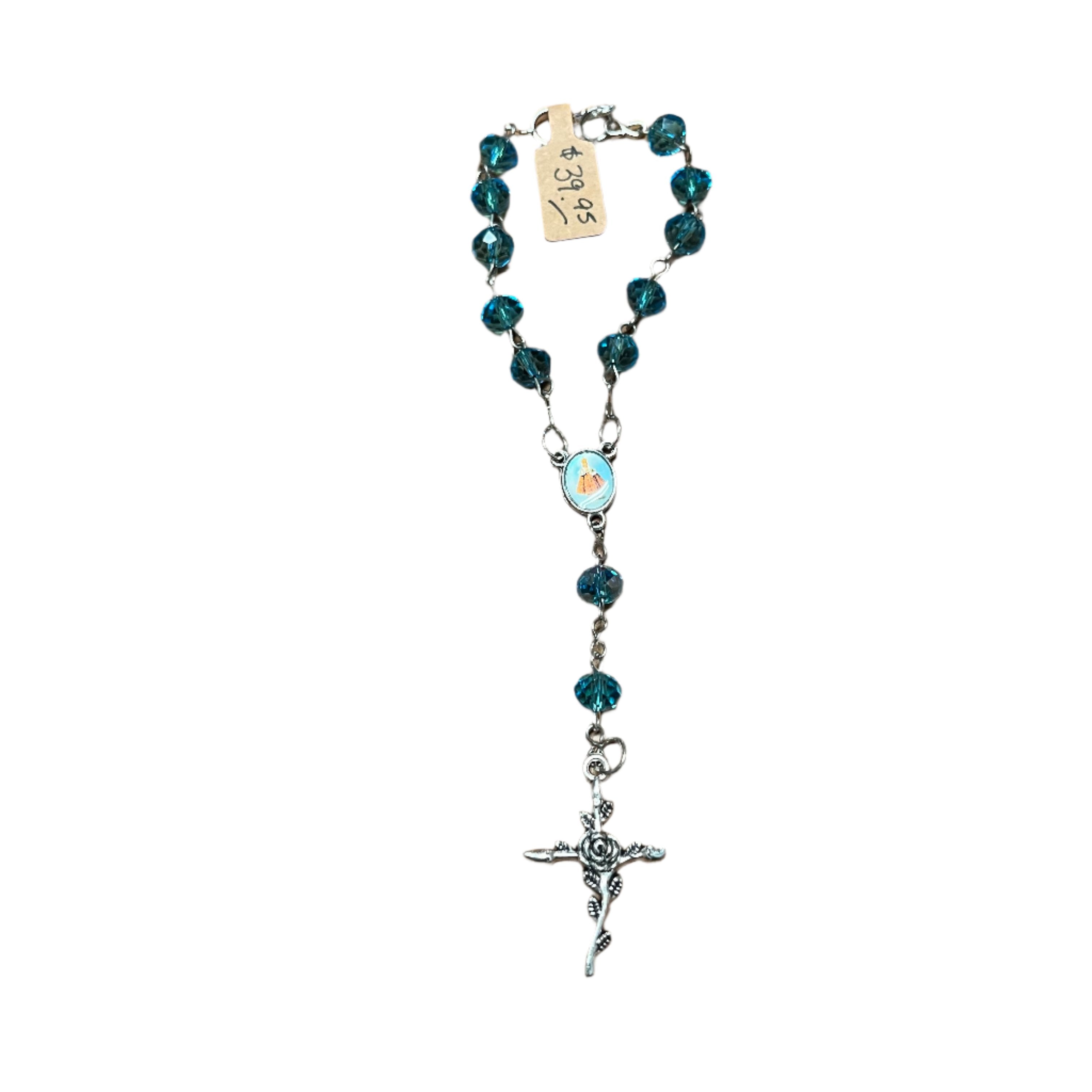 Celebrate a wedding by attaching this beautiful locally hand-made rosary to your bouquet. Affix to your cars rear-view mirror afterwards for protection in you travels. This piece can act as your "something blue".
