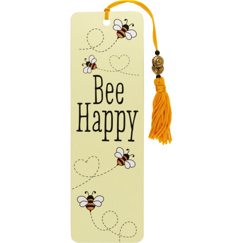 - Four buzzing bees leave circle- and heart-shaped trails on the soft yellow surface of this appealing beaded bookmark.
