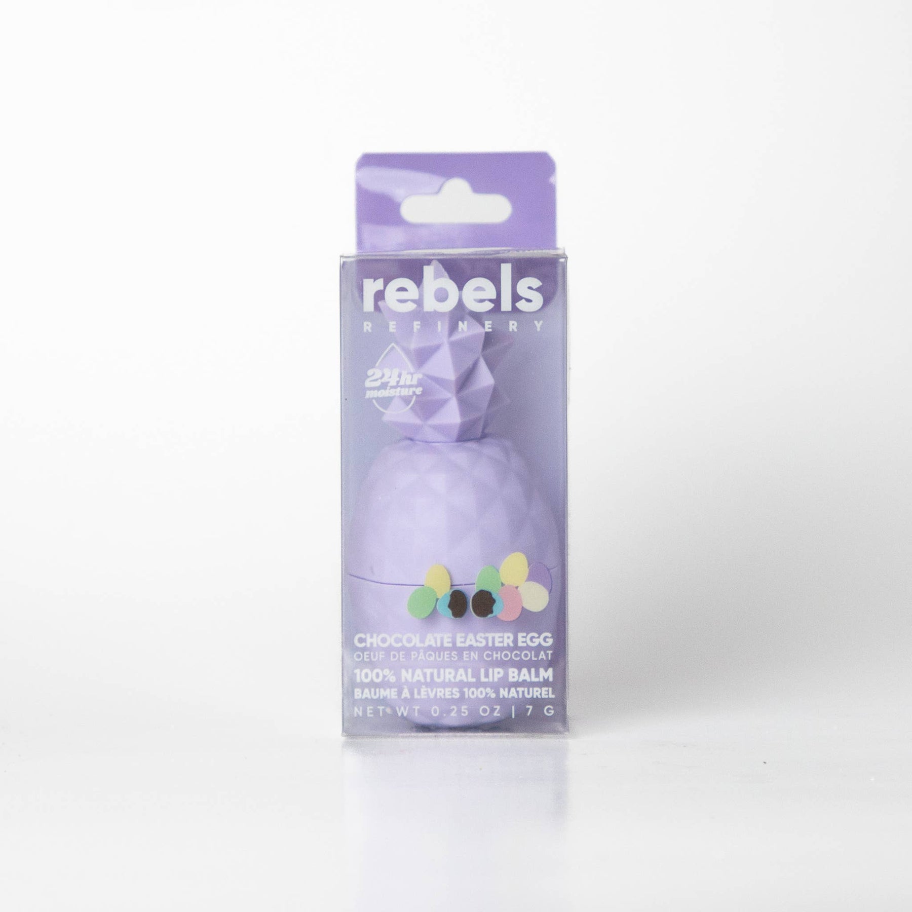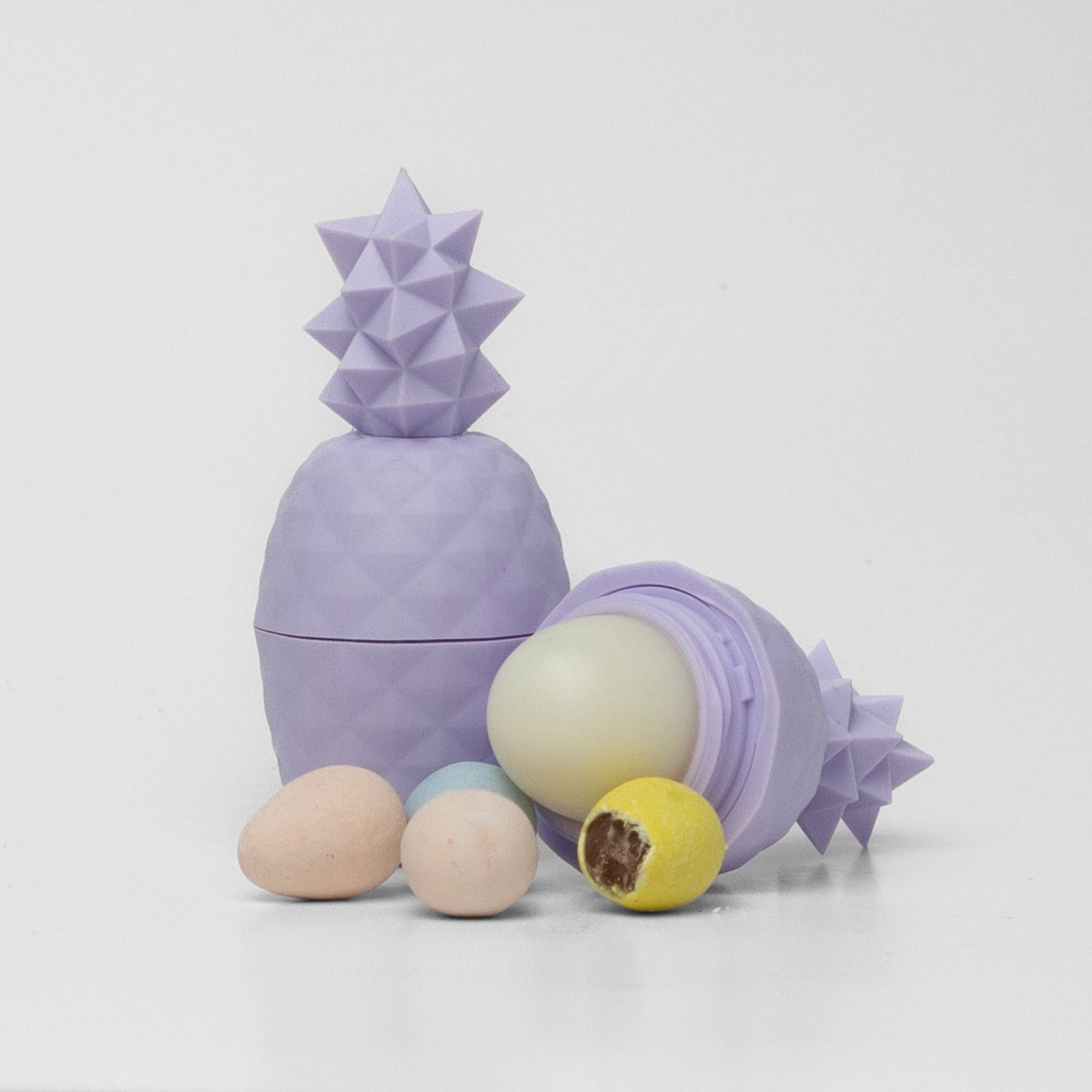An assortment of two flavoured lip balms, Purple Pineapple- Chocolate Easter Egg and Cream Pineapple- Marshmallow. Pineapples are a symbol of big greetings and warm welcomes. Pop open this pineapple and say a big “welcome” to soft, moisturized lips and a big smile. This 100% natural pineapple is packed with the highest quality coconut and sweet almond oils designed.