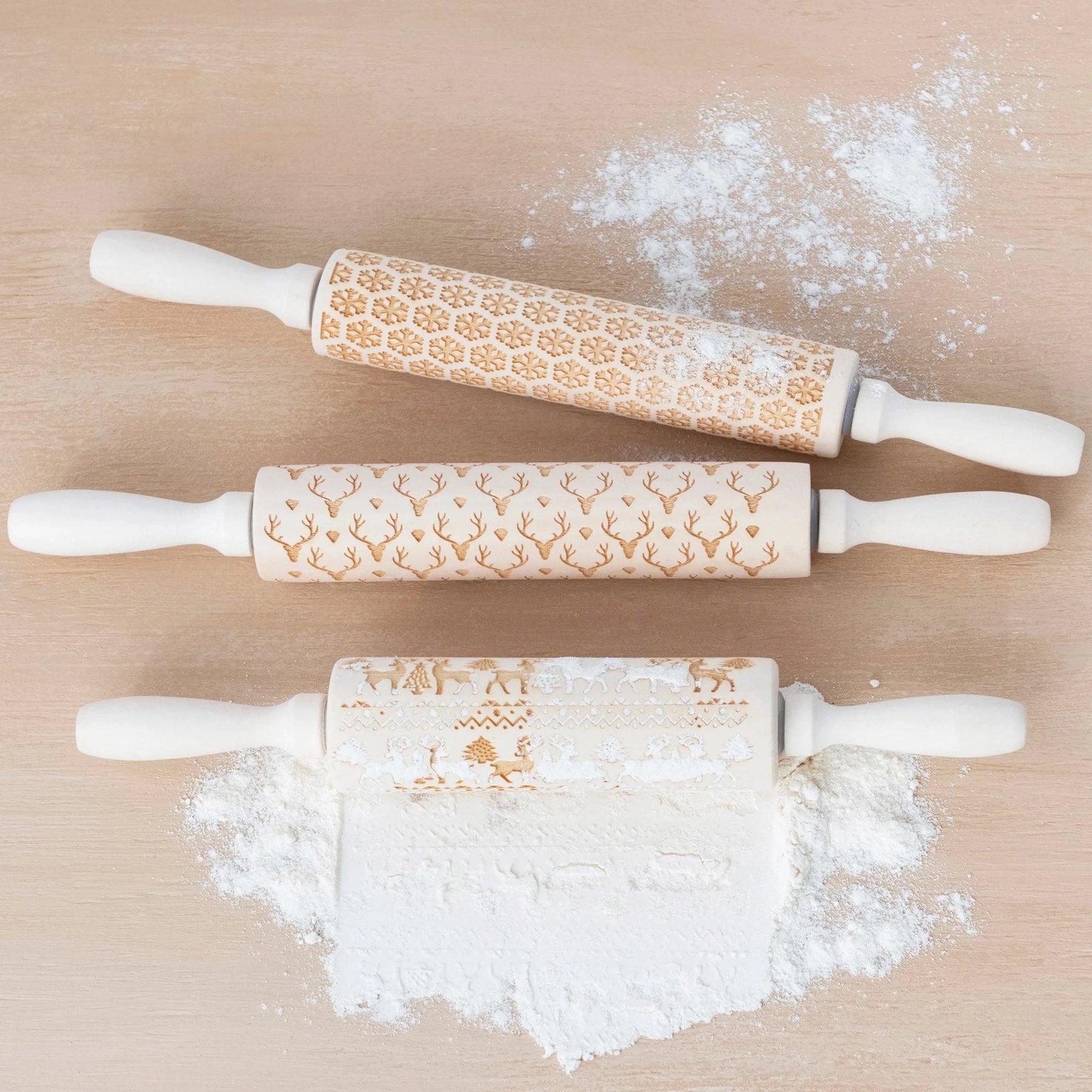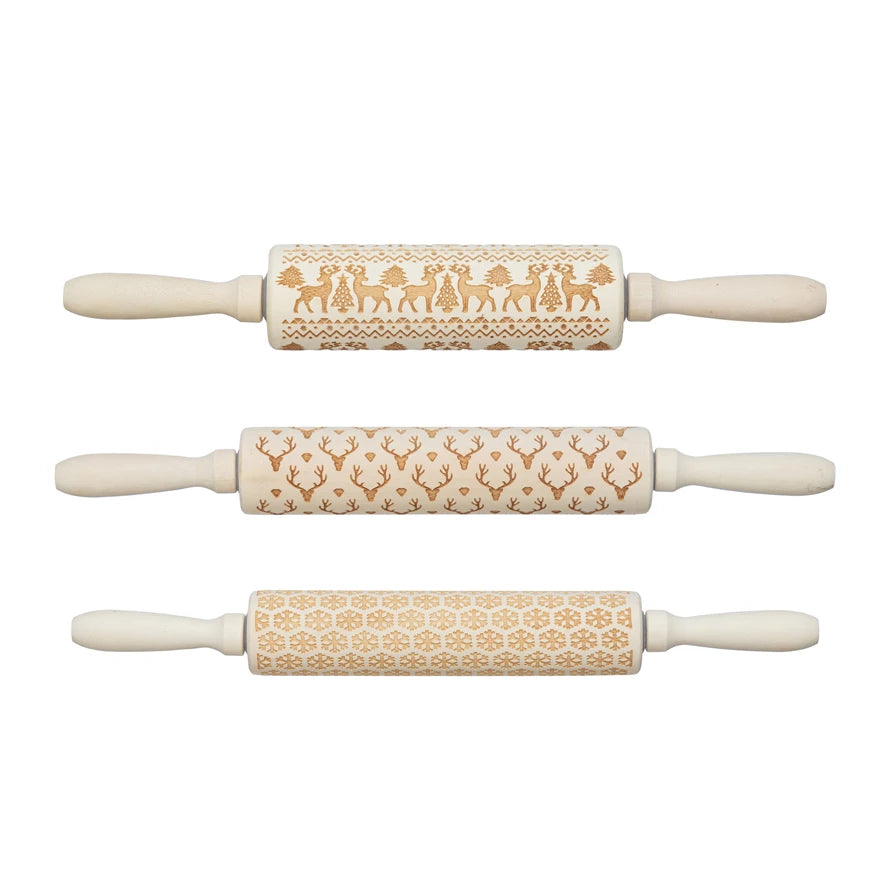 15"L x 2"W Carved Wood Rolling Pin with holiday patterns.