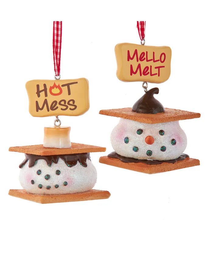 Kurt Adler's glittered s'mores ornaments are a fun addition to any holiday décor or Christmas tree. This assortment includes a "Hot Mess" glittered marshmallow s'more and a "Mello Melt" glittered marshmallow s'more.
