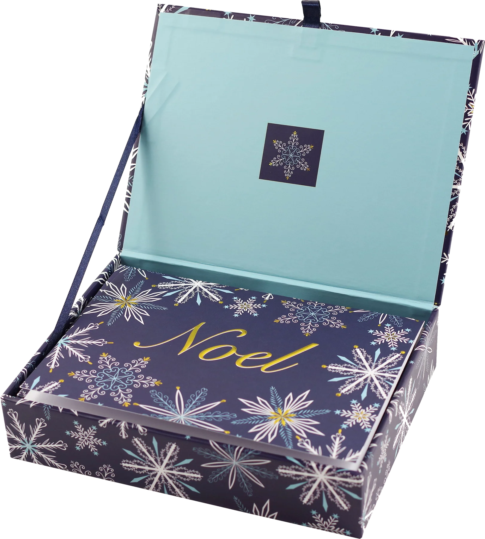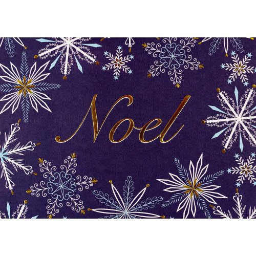 The word ''Noel'' is stamped in gold foil and surrounded by delicate snowflakes on this elegant greeting card.