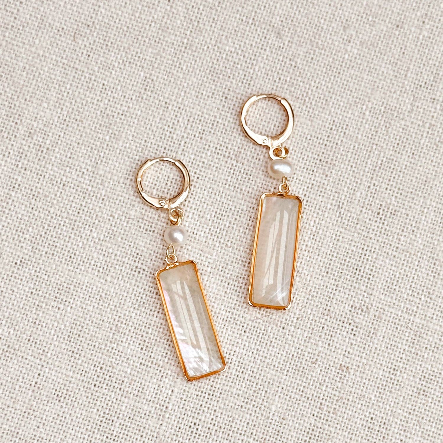 Drop earrings feature freshwater pearl and mother of pearl look. Made in Vancouver, Canada