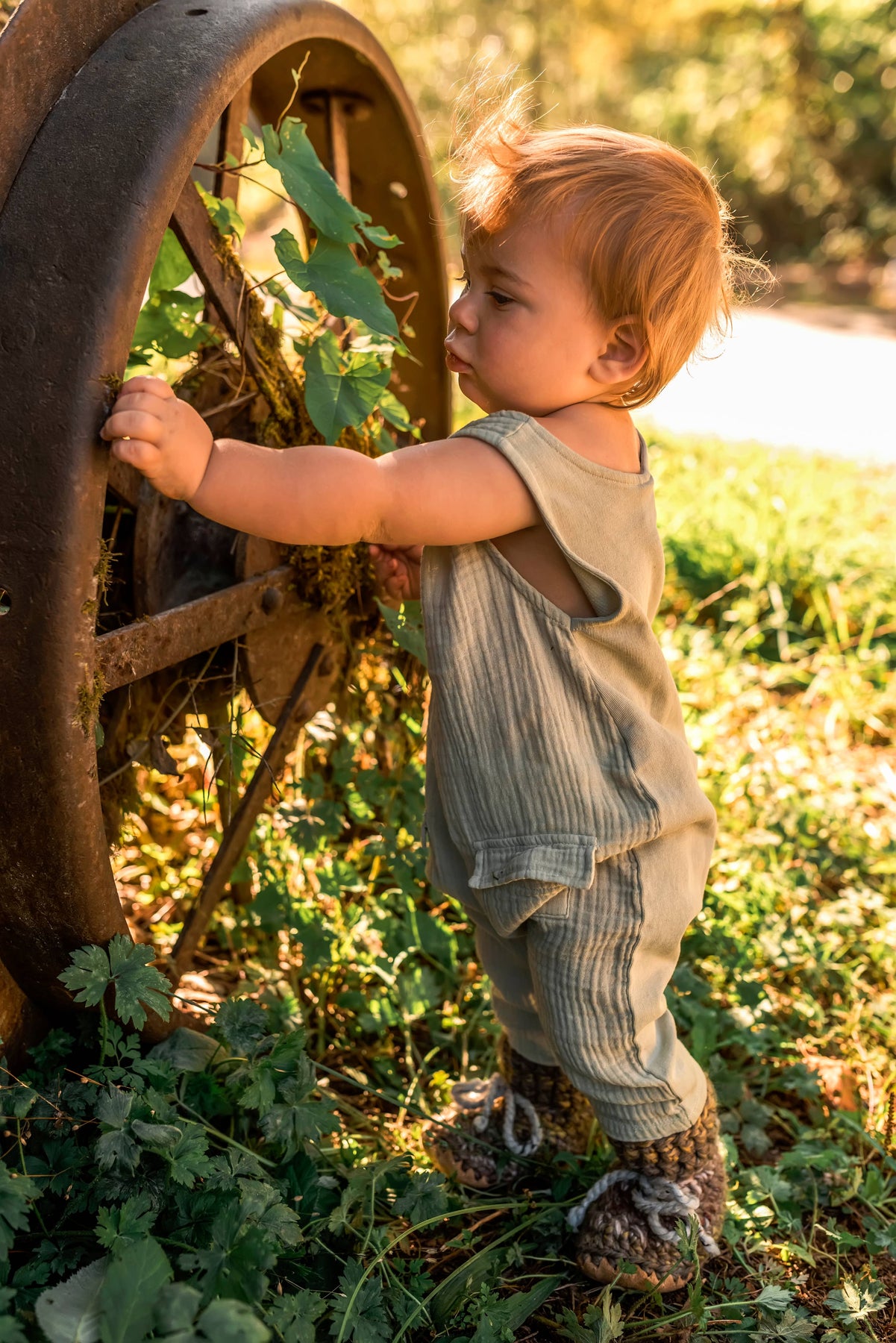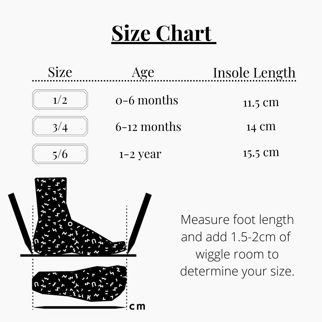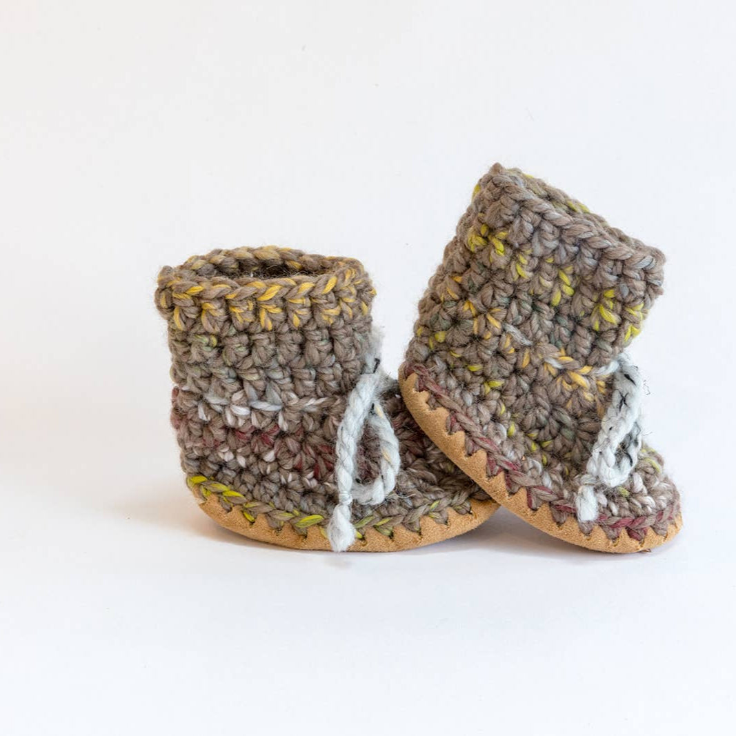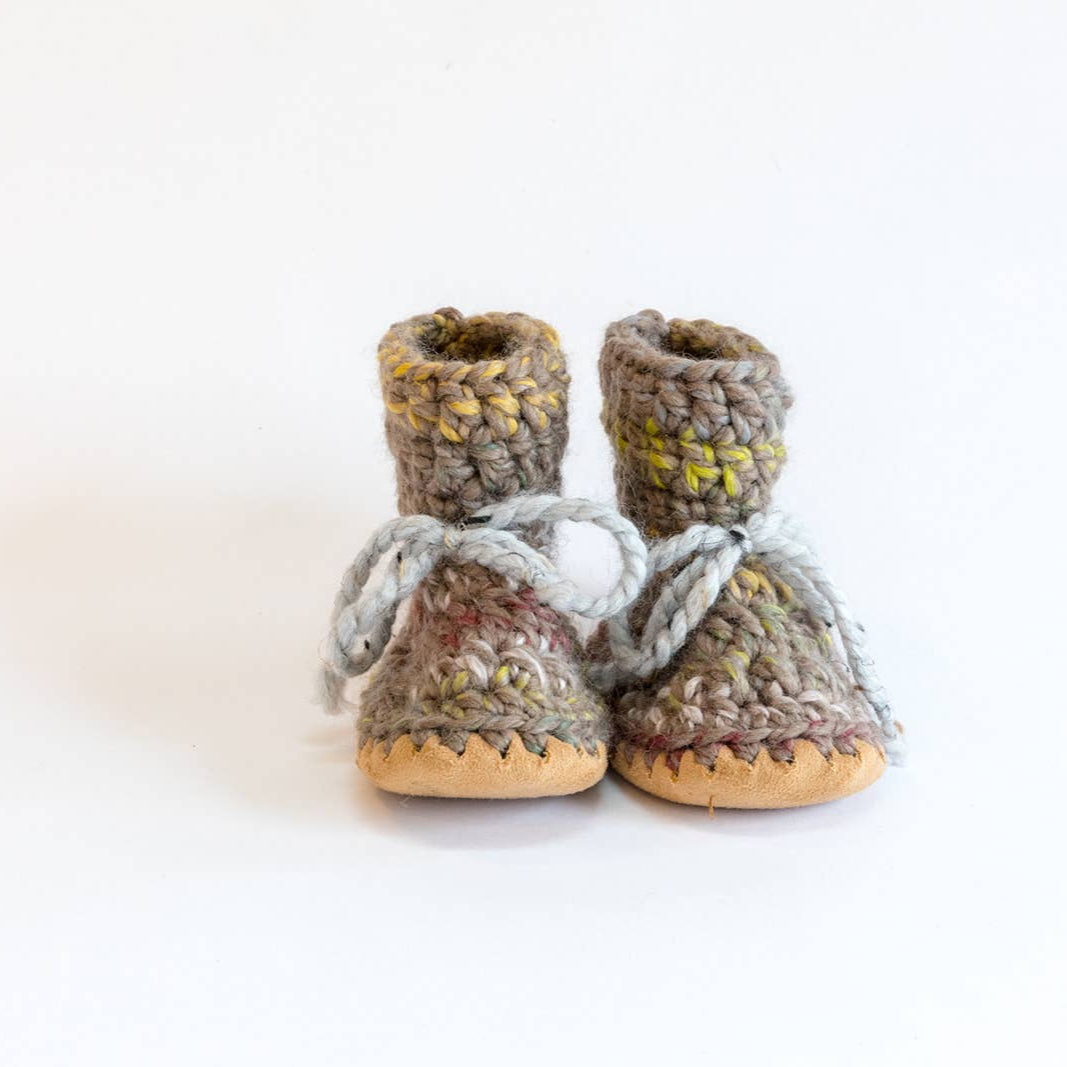 Huddy Buddies are made with a durable and washable eco-suede sole which is lined with a plush faux-fur for comfort and warmth. The hand crocheted uppers are made with soft 20% wool blend yarn that is soft and not itchy. These soft sole slippers will easily slip-on any little foot no matter how chubby or narrow... and STAY PUT with their functional laces. Be sure you tighten those laces and you will not arrive home to find one slipper missing and cold little toes. The soft soles not only allow these slippers to grow with your baby over many sizes but they are also weather-resistant and great for indoor and outdoor use. Mind you the crochet portion of the slipper is not very fond of puddles. If you do get them dirty simply throw in the washing machine and then let them air dry. Pediatricians recommend soft soles for littles up to two years to allow for healthy foot development and to promote balance and coordination to early walkers. The next best thing to barefoot are Huddy Buddies.