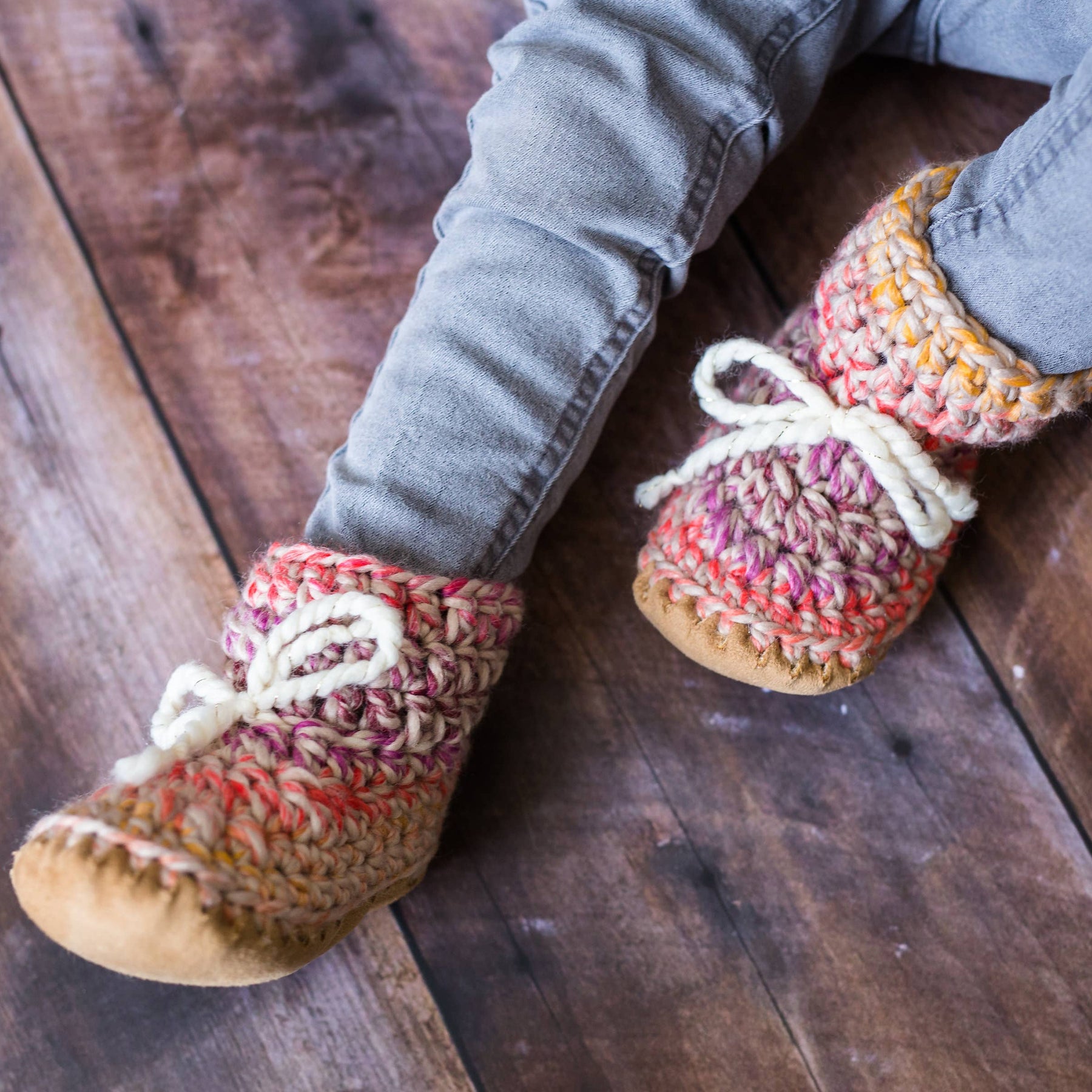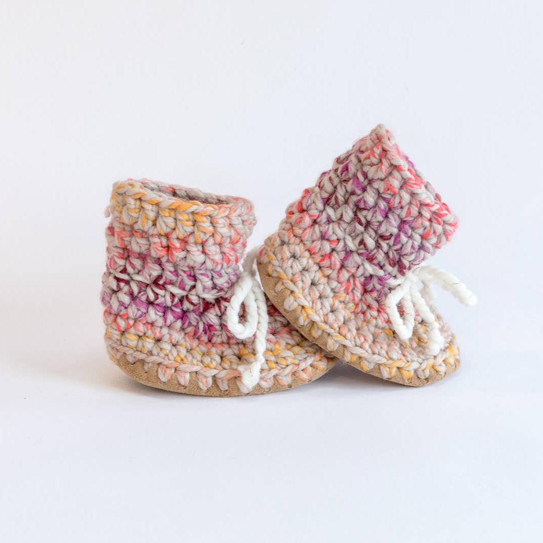 Huddy Buddies are made with a durable and washable eco-suede sole which is lined with a plush faux-fur for comfort and warmth. The hand crocheted uppers are made with soft 20% wool blend yarn that is soft and not itchy. These soft sole slippers will easily slip-on any little foot no matter how chubby or narrow... and STAY PUT with their functional laces. Be sure you tighten those laces and you will not arrive home to find one slipper missing and cold little toes. The soft soles not only allow these slippers to grow with your baby over many sizes but they are also weather-resistant and great for indoor and outdoor use. Mind you the crochet portion of the slipper is not very fond of puddles. If you do get them dirty simply throw in the washing machine and then let them air dry. Pediatricians recommend soft soles for littles up to two years to allow for healthy foot development and to promote balance and coordination to early walkers. The next best thing to barefoot are Huddy Buddies.