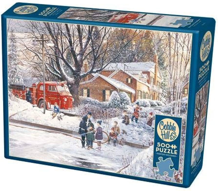 The fire department has brought their big red firetruck to spray the hockey ice pond, with the help of town kids, in preparation for the Big Game Tomorrow. A delightful 500 piece puzzle.