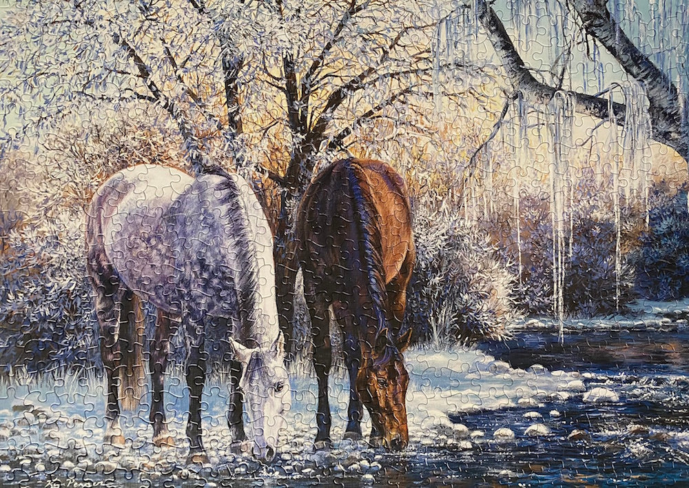 The forest trees are frosting, but the crisp water is still running to refresh the beautiful horses enjoying Winter's Beauty. A 500 piece horse lovers challenge. Artist / Licensor: Kim Penner