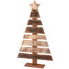 A decorative Christmas tree from our Christmas Collection displaying a rustic slat wood design. Christmas tree features slats of wood cut to form a tall tree shape with star on top. Each wood piece features distressed details and subtle painted accents. Our tall slat Christmas tree is designed to free-stand on flat surface for display. A rustic seasonal home accent perfect for the holidays.