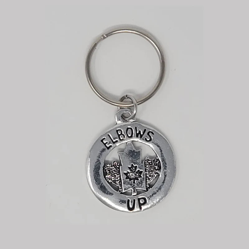 Crafted with high-quality, lead-free pewter, this keychain features the popular Canadian saying “Elbows Up”—a playful nod to our no-nonsense, elbows-on-the-table kind of spirit.
