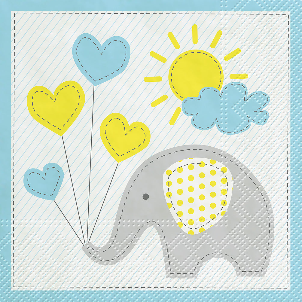 Make any baby shower a little more celebratory with this 20-pack of cuddly elephant luncheon napkins. These sturdy, stylish paper napkins feature an adorable elephant clutching heart-shaped balloons with baby-blue accents – great for serving alongside lunches or dinners.