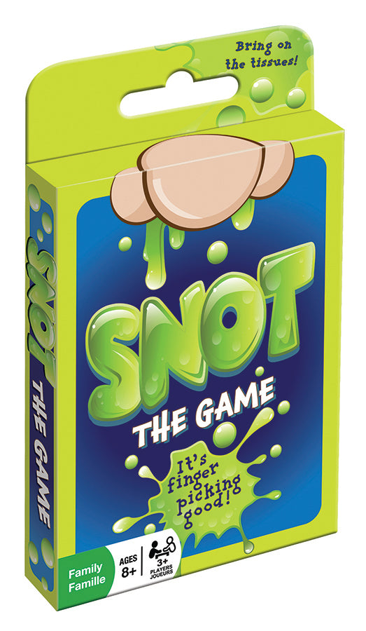 Snot is a game that is not to be sneezed at! Players lay their cards in sequence from Ahhh, to Choo, to Snot, then Tissue! Play a Snot Me card to skip the next player, or Back Up Bogey card to change the direction of play! Breathe freely when you play your last card to win the game!